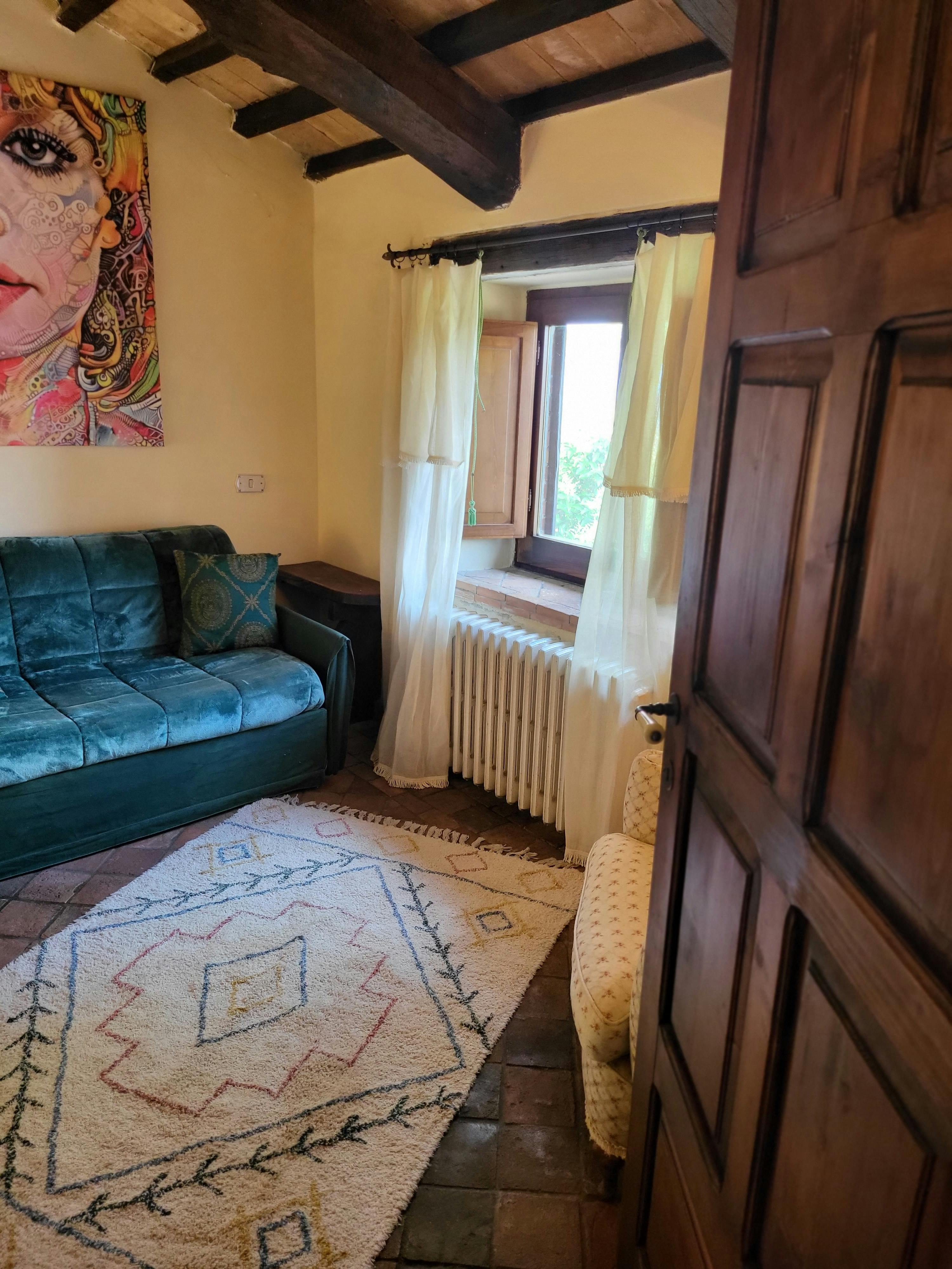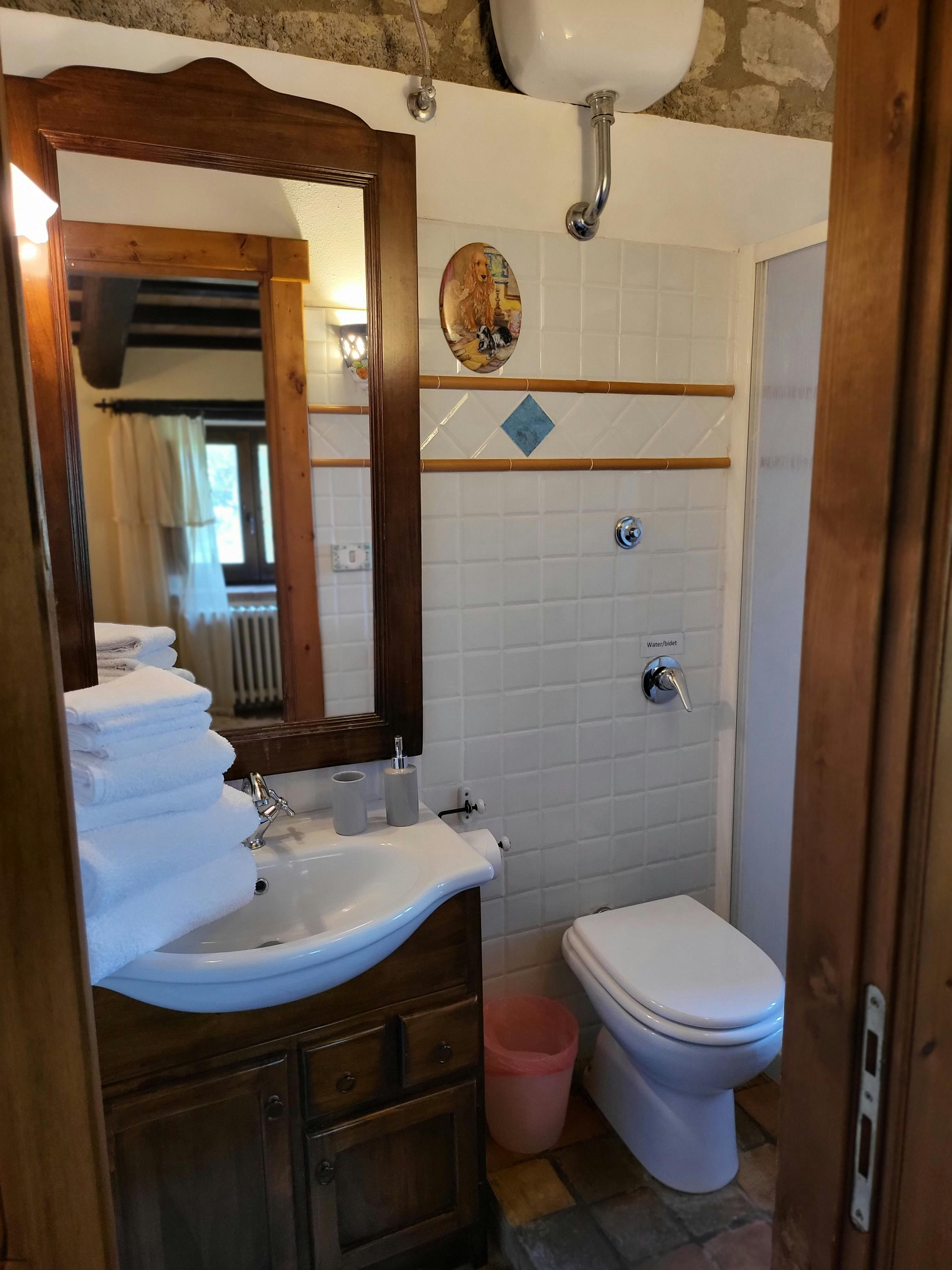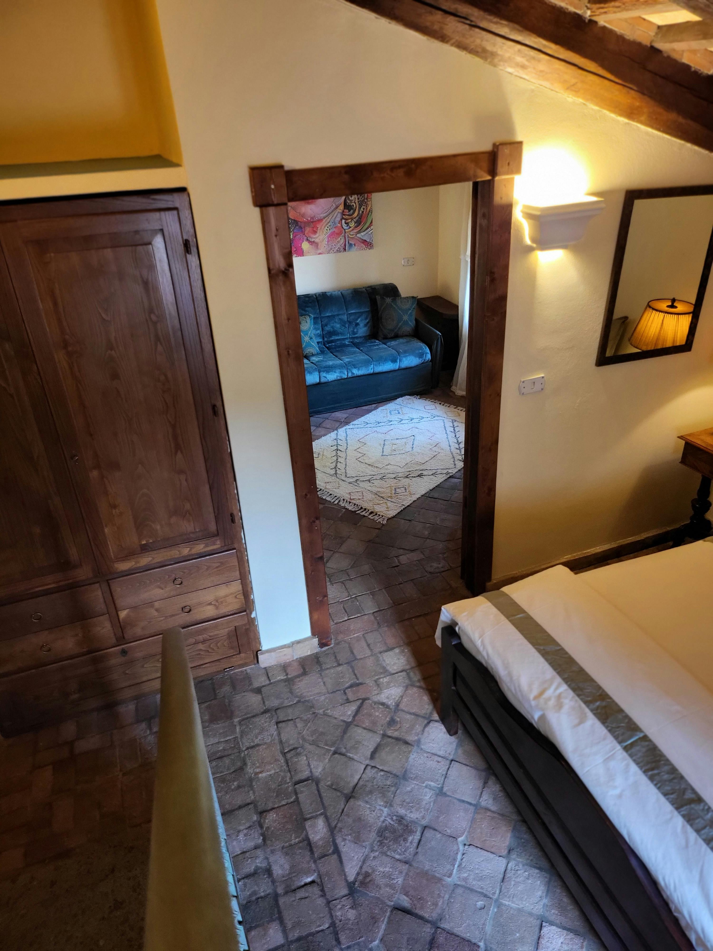 Camera da letto con letto matrimoniale (160x200) e piccola zona giorno. Nel bagno trovate asciugamani, asciugacapelli e doccia. La biancheria da letto è inclusa. Vista panoramica.